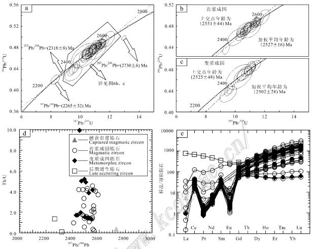结合锆石阴极发光(CL)图像(图5)以及U_Pb谐和年龄(图6a~c),除去极不谐和的8组 数 据,锆石207Pb/206Pb年龄可分为4组(图6a~c): ①(2730±6) Ma,测点14GDP2_1_04,位于锆石核部,CL图像较暗,应属捕获岩浆锆石; ② 2591~2409 Ma,26个 测点,位于锆石核部,CL图像较暗,多具微弱环带,且根据锆石中富集重稀土元素的特征判 断(图6e), 应为岩浆成因, 上交点年龄为 (2551±44) Ma(MSWD=0.37); ③ 2551~2426 Ma,13个测点,位于锆石边部,CL图像较亮,无分带或 弱分带,应为变质成因锆石,上交点年龄为( 2525±48) Ma(MSWD =0.16); ④ (2318±8) Ma和(2265±23) Ma,测点14GDP2_1_ 0 6和14GDP2_1_17,位于锆石边部,CL图像较暗,无分带,且根据锆石中稀土元素分布相对平 坦的特征判断(图6e),应为后期变质增生锆石,投图位于年龄谐和曲线上,加权平均年龄 为(2312±210) Ma(MSWD=4.7)。