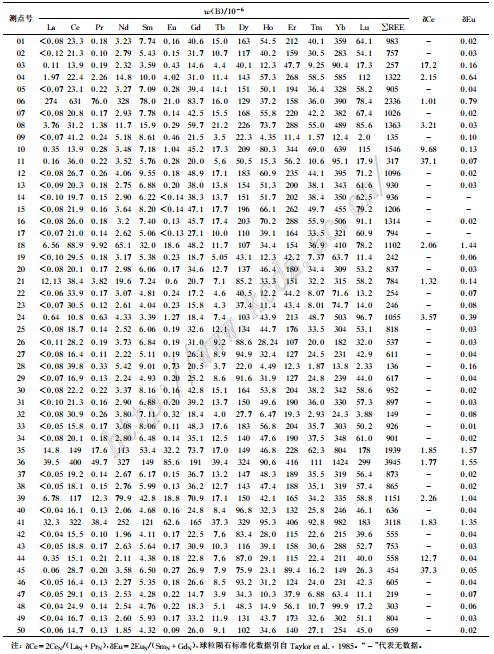 表 2官地铁矿床斜长浅粒岩(样品14GDP2_1)锆石稀土元素分析结果 Table 2Zircon rare earth elements content data of plagioclase leucoleptite(sa mple 14GDP2_1)of the Guandi iron deposit |