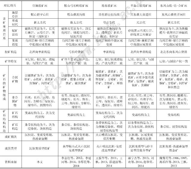 根据本次研究结果及前人资料,将官地铁矿床与辽宁鞍山地区弓长岭铁矿床、吉林敦化地区 塔东铁矿床、黑龙江佳木斯地区羊鼻山铁钨矿床和东风山铁_钴_金矿床进行综合对比分析( 表3)。结果表 明:官地铁矿与弓长岭铁矿的含矿变质岩系的形成时代均为新太古代,赋矿岩石以条带状磁 铁石英岩为主,其变质程度均为角闪岩相_绿片岩相的中低级区域变质;吉黑东部的塔东、 羊鼻山、东风山等矿区的含矿变质岩系的形成时代为元古代—早古生代,含铁岩系分别以磁 铁斜长角闪岩、矽线黑云石英片岩、铁闪岩为主,其变质程度分别为角闪岩相和角闪岩相_ 麻粒岩相,变质程度明显高于官地和弓长岭铁矿的含矿变质岩系。