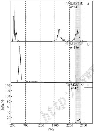 图 7华北克拉通(a)、佳木斯_兴凯(b)、官地铁矿区(c)锆 石年龄频谱图 华北克拉通年龄数据源自Cope等(2005),Yang 等(2006),Li 等 (2009),胡 国辉等( 2012);佳木斯_兴凯年龄数据源自周建波等 (2012);官地铁矿区年龄数据源自 本文 Fig. 7Relative probability distribution of the zircon ages from the North Chin a Craton (a), Jiamusi_Xingkai block (b), and Guandi iron deposit (c) Note: (a) data are from Cope et al. (2005), Yang et al. (2006), Li et al. (2009 ), Hu et al. (2012); (b) data are from Zhou et al. (2012); (c) data are from this paper |