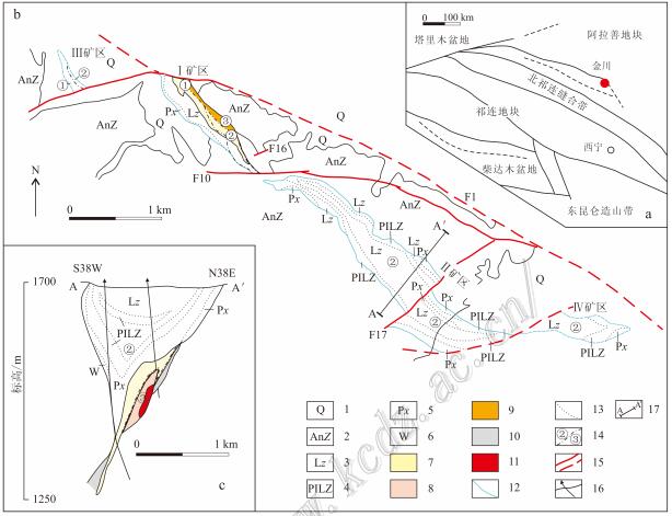 图 1金川矿床大地构造位置(a)、矿区平面(b)和剖面(c)地质略图(据汤中立,199 6修改) 1—第四系; 2—前寒武系; 3—二辉橄榄岩; 4—含长二辉橄榄岩; 5—橄榄二辉岩; 6 —二辉岩; 7—浸染状矿体; 8—海绵陨铁状 矿体; 9—氧化矿体; 10—交代矿体; 11 — 块状硫化物矿体; 12—岩体界线; 13—侵入体岩相界线; 14—侵入期次编号及界线; 15 —断层; 16—钻孔; 17—勘探线及编号 Fig. 1Geographical location (a), sketch geological plan view (b) and geologica l sections (c) of the Jinchuan deposit (modified after Tang,1996) 1—Quaterary; 2—Proterosic; 3—Lherzolite; 4—Plagioclase lherzolite; 5—Ol ivine websterite; 6—Websterite; 7—Disseminated ore; 8—Sideronitic ore; 9—Oxidised ore; 10—Metasomatic ore; 11—Massive ore; 12—Ultramafic rock c ontact; 13—Magmatic facies contact; 14—Serial number of intrusive stage an d boundary; 15—Fault; 16—Drill hole; 17—Exploration line and its numbe |