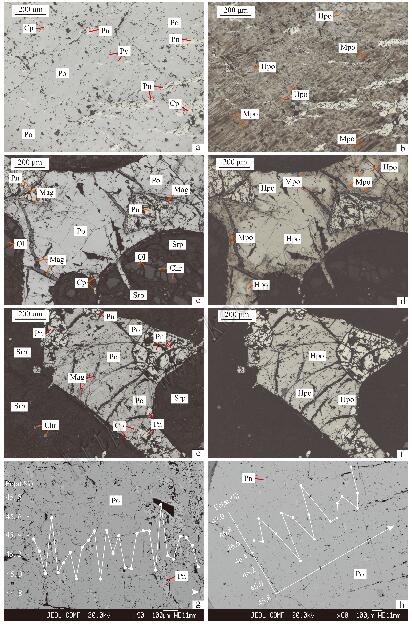 单纯的Hpo该结构类型多见于浸染状矿石与海绵陨铁状矿石中。磁黄铁矿为单纯 的Hpo(图3f),未见Mpo,脉石矿物为蛇纹石化的橄榄石、辉石等。