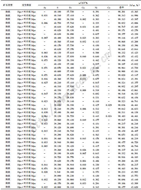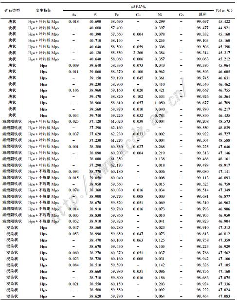 降温到低于254℃以后,在浸染状矿石和海绵陨铁状矿石中,磁黄铁矿以Hpo与Mpo的不规 则交生体或单纯Hpo的形态产出。块状矿石中,磁黄铁矿以Hpo与Mpo的叶片状交生体形态产 出。对电子探针取得的数据进行分类统计,以金属原子(Fe、