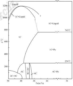 图 5Fe_S系统简化相图(据Arnold,1962;1969; Desborough et al.,1965;Kissin et al.,1982修编) 1C—1C型磁黄铁矿; 2C—陨硫铁; 4C—4C型磁黄铁矿; NC —NC型磁黄铁矿; Liquid—液相; Py—黄铁矿 Fig. 5Equilibrium diagram of Fe-S mineral phase system(modified after Arnold ,1962;1969;Desborough et al.,1965; Kissin et al.,1982) 1C—1C pyrrhotite; 2C—Troilite; 4C—4C pyrrhotite; N C—NC pyrrhotite; Py—Pyrite |