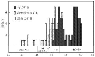 Ni、Cu、Co)与百分数为横坐标绘制频数分布直方图(图6)。浸染状矿 石中磁黄铁矿落入4C+NC和NC相区;海绵陨铁状矿石中磁黄铁矿主要落 入4C、NC、及2C+NC相区;块状矿石中的磁黄铁矿落入4C+Py相区和4 C相区。依据Fe_S系统简化相图(图5)和磁性胶体所揭示的磁黄铁矿结构 类型,块 状矿石中磁黄铁矿还应当落入4C+NC相区,但其成分均位于4C+NC相区的右 侧,这可能是磁黄铁矿中存在亚显微级黄铁矿造成的。