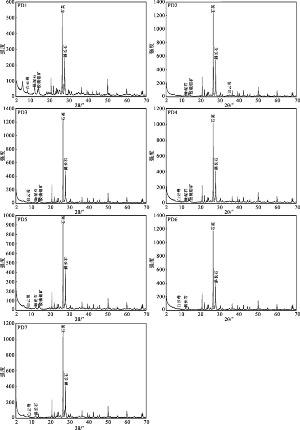 X射线粉晶衍射仪型号为Brock D8,测试条件:电流40.0 mA,电压40.0 kV,扫描范围(2θ)2°~70°,扫描步长0.02°,每步扫描时间0.25 s。矿物种类通过JADE 8.6软件与PDF-4+2022数据库中各种矿物的标准曲线进行比较确定,矿物含量通过对样品XRD图谱采用峰面积积分的方法确定。