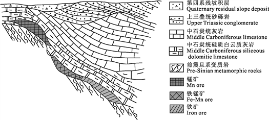 新疆西天山莫托萨拉沉积型铁锰矿,产于石炭系阿克沙依组含矿亚组中,上部是锰矿层,夹赤铁矿及碧玉岩层,下部由赤铁矿夹硅质岩、砂岩、粉砂岩组成,上下之间夹有数米含铁砂岩、细砂岩,代表了较短的时间间隔(图5)。