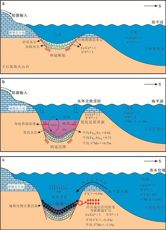 前面讲过,中国新疆发现的西昆仑玛尔坎苏锰矿带,具有低铁富锰的特征。西昆仑玛尔坎苏锰矿带是中国北方近年来最重要的锰矿找矿突破,初步查明锰矿石资源量超5000万吨,平均品位达35%以上,被认为是中国品位最富的锰矿床(高永宝等,2017;张连昌等,2022)。Dong等(2023)新近提出了一种新的优质富锰矿沉积成矿模式(图11a~c),该模式认为西昆仑玛尔坎苏锰矿带的形成经历了盆地的伸展断陷、锰质积累和巨量沉淀3个阶段:第一阶段,由于受到与古特提斯洋俯冲有关的弧后拉张作用(张连昌等,2020),在玛尔坎苏碳酸盐台地上出现具有伸展性质的次级凹陷(图11a);第二阶段,次级凹陷逐步演变为闭塞深水盆地,由于与广海沟通受阻,盆地水体具有上部氧化-下部硫化的分层结构,由于间歇性的海底热液活动,通过伸展断层淋滤下伏石炭系火山岩和志留系富锰岩系中的大量锰质(张连昌等,2022),并以溶解Mn2+离子形式将它们注入到缺氧硫化深水中。由于Mn2+离子与H2S的亲和力很弱,很难形成硫化物沉淀下来(Krauskopf, 1957),所以只能暂时在缺氧硫化深水环境积累浓集。而热液流体中的Fe2+离子在硫化水体中会快速以黄铁矿的形式沉淀,优先形成了富黄铁矿的黑色页岩,促进了铁、锰之间的彻底分离(图11b);第三阶段,与晚古生代冰期事件有关的海平面大幅度升高使含氧海水越过“障壁”,“侵入”到玛尔坎苏局限盆地底部,打破了原本氧化还原分层的水体结构,诱发原来硫化深水中积累的大量Mn2+离子发生氧化沉淀。巨量埋藏的锰氧化物在早期成岩过程中与有机质发生氧化还原反应,转变为优质碳酸锰矿层(图11c,Dong et al., 2023)。