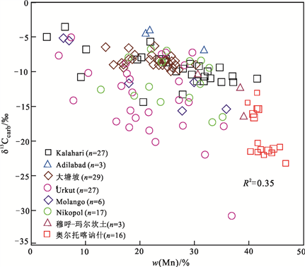 图9世界各地不同碳酸锰矿床无机碳同位素组成和锰含量之间的协变图(数值来源据表1)
