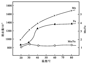 姚敬劬(1995)选择石英闪长岩、硅质岩、片岩、碳酸盐岩4种岩性做铁、锰浸出试验,结果铁、锰浸出试验有2种情况,片岩和硅质岩锰的浸出率分别为17.23%和20.41%,铁的浸出率只有2.30%和5.58%。同时Mn/Fe比值从pH=3开始明显增大,到pH=5时达到最高值(图7a、b)。而碳酸盐岩和石英闪长岩不论何种pH值浸液中锰、铁分离都很差,Mn/Fe比是一条低值平缓的直线(图7c、d)。浸出温度试验表明铁、锰的浸出量随温度升高而同步增大,Mn/Fe比值保持稳定(图8)。