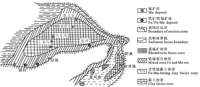 有的由于区域环境随时间演化而发生变化形成空间上的分带,如遵义锰矿区铁锰围绕盆地中心的分带主要是由于沉积区的铁、锰分离造成的富含铁、锰的流水进入盆地,在其边缘部分,进入中性或弱碱性环境、铁质先全部沉淀,使水体中铁质降低而锰质大部分保留,当运移到盆地中心变成碱性环境,这时锰质大量沉淀形成菱锰矿层(图3、图4)。