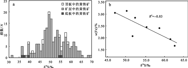 Fig. 10 Histogram of pyrite S isotope(a) in the Nanhua manganese deposits and correlation graph (b) of average S isotope of pyrite with Fe content in ores (after Wu et al., 2015)