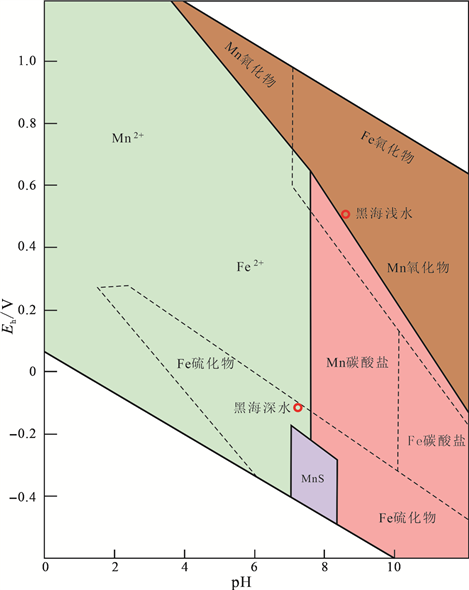 图6自然条件下H2O-Fe-Mn-CO2-S体系综合相图 各组分浓度为现代黑海的实际浓度,虚线为铁各矿物相稳定域,红圈标注了黑海浅水和深水的Eh-pH条件,改自Hem, 1972; Force et al., 1991