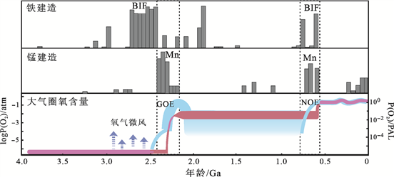 Fig. 1 Schematic diagram of the relationship between iron and manganese Formations and two great oxidation events (GOE and NOE) in earth history Burgundy represents the classic "two-stage model" of atmospheric oxidation, while blue represents a possible new alternative model(after Bekker et al., 2010; 2014; Lyons et al., 2014)