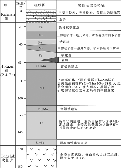 图2南非卡拉哈里锰矿与BIF型铁矿关系柱状图(据Beukes et al., 2016修编)