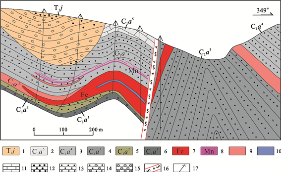 Fig. 5 Geological profile of the Motosala Iron-manganese deposit in the West Tianshan Mountains (according to Dong et al., 2021) 1—Lower Triassic Jianshanguou Formation; 2—The fifth lithologic member of the Lower Carboniferous Akshake Formation; 3—The fourth lithologic member of the Lower Carboniferous Akshake Formation; 4—The third lithologic member of the Lower Carboniferous Akshake Formation; 5—The second lithologic member of the Lower Carboniferous Akshake Formation; 6—The first lithologic member of the Lower Carboniferous Akshake Formation; 7—Iron ore body; 8—Manganese ore body; 9—Iron jasper; 10—Siliceous rock; 11—Crystalline limestone; 12—Coarse sandstone; 13—Fine sandstone; 14—Pebbled sandstone; 15—Conglomerate; 16—Fracture zone; 17—Drill hole