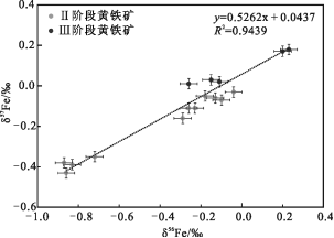 淋湘金矿床Ⅱ~Ⅲ成矿阶段黄铁矿样品中16个铁同位素LA-ICP-MS分析结果显示(表4),Ⅱ成矿阶段黄铁矿的δ57Fe集中在-0.43‰~-0.03‰(均值为-0.19‰),δ56Fe集中在-0.87‰~-0.04‰(均值为-0.41‰),Ⅲ成矿阶段黄铁矿的δ57Fe集中在0.01‰~0.18‰(均值为0.08‰),δ56Fe集中在-0.26‰~0.23‰(均值为-0.02‰),反映Ⅱ成矿阶段铁轻同位素富集,Ⅲ成矿阶段铁轻、重同位素均较为富集(表4)。所有样品的δ56Fe和δ57Fe值呈线性相关(图5),其δ57Fe=0.5262×δ56Fe+0.0437(R2=0.9439),与理论上的铁同位素平衡质量分馏曲线斜率基本一致,表明本次测试的淋湘金矿床中Ⅱ~Ⅲ不同成矿阶段矿物中铁同位素数据质量较高,指示结果高度可信。